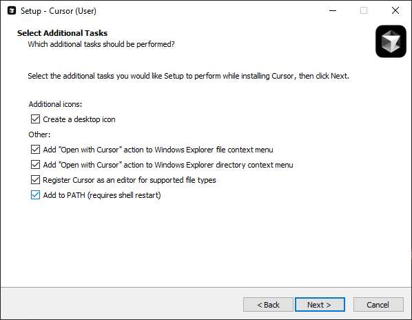Download and install the Cursor editor: <https://www.cursor.com/downloads>, while installing make sure to check all the checkmarks (Picture #1)